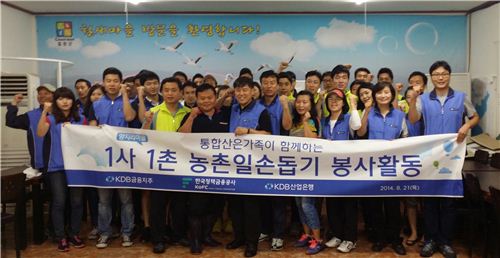 ▲KDB산업은행, 정책금융공사, 산은금융지주 직원이 농촌봉사활동을 끝내고 기념촬영을 하고 있다.