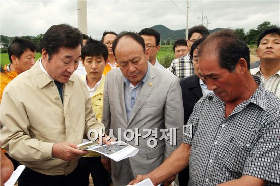이낙연 전남도지사(왼쪽)가 21일 오후 지난 17·18일 집중호우로 주택과 농경지 침수피해를 입은 영광군 법성면 신장리 현장을 둘러보고 있다. 이 지사는 피해를 입은 주민들이 빠른 시일 내에 일상생활에 복귀할 수 있도록 지원과 복구에 최선을 다할 것을 관계 공무원에게 지시했다. 사진제공=전남도<br />