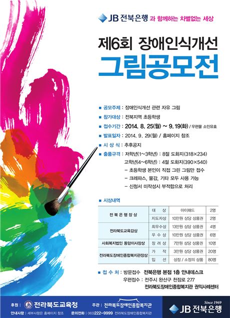 [아시아경제 조은임 기자] JB전북은행과 전라북도 장애인종합복지관이 장애에 대한 편견 해소와 장애인식 개선을 위해 '제6회 JB전북은행과 함께하는 차별없는 세상 장애인식개선 그림공모전'을 실시한다고 22일 밝혔다. 이번 그림공모전은 오는 25일부터 9월19일까지 전라북도 초등학생을 대상으로 진행된다. 참가자들은 '장애인식개선 관련 자유그림'을 전북은행 본점 1층 안내데스크에 방문 접수하거나 전라북도장애인종합복지관(전주시 완산구 천정로 277)에 우편접수 하면 된다.김한 은행장은 "차별없는 세상 그림공모전을 통해서 초등학생뿐만 아니라 모든 이들의 장애에 대한 인식이 긍정적인 변화가 불러왔으면 좋겠다"며 "장애를 가진 아이들이 자신의 잠재된 능력을 발휘할 수 있도록 지원하겠다"고 말했다.조은임 기자 goodnim@asiae.co.kr<ⓒ세계를 보는 창 경제를 보는 눈, 아시아경제(www.asiae.co.kr) 무단전재 배포금지>