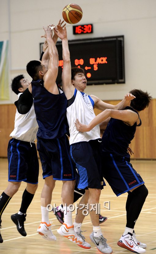 [진천=아시아경제 김현민 기자] 2014 스페인농구월드컵과 인천아시안게임을 앞둔 남자 농구 국가대표팀이 21일 진천선수촌에서 자체 연습게임을 통해 마지막 담금질을 했다. 김종규가 오세근, 이종현과 리바운드를 다투고 있다. 김현민 기자 kimhyun81@asiae.co.kr<ⓒ세계를 보는 창 경제를 보는 눈, 아시아경제(www.asiae.co.kr) 무단전재 배포금지>