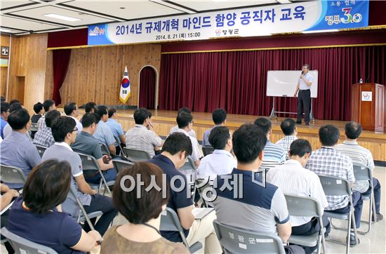 영광군(군수 김준성)은 지난 21일 군청회의실에서 군 산하 전 직원을 대상으로 기업애로 및 주민 불편을 초래하는 불합리한 규제의 개혁을 위한 2014년 규제개혁 마인드 함양 공직자 교육을 실시했다.<br />