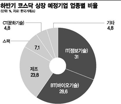 [아시아경제 박미주 기자]올해 하반기 코스닥시장에 상장 예정인 기업이 40곳을 넘는 것으로 나타났다. 이에 따라 한국거래소는 올해 목표 '코스닥 70개사 상장'을 무난히 달성할 전망이다. 이런 가운데 바이오기술(BT)ㆍ정보기술(IT) 분야 업체들이 대거 기업공개(IPO)에 나서 눈길을 끈다. 1일 거래소에 따르면 올해 하반기 코스닥 시장에 상장 예정인 기업은 총 42개인 것으로 나타났다. 업종별로는 IT가 13개(31.0%)로 가장 큰 비중을 차지했다. 뒤이어 BT(12개ㆍ28.6%), 제조(10개ㆍ23.8%), 스팩(3개ㆍ7.1%), 문화기술(CTㆍ2개ㆍ4.8%), 기타(2개ㆍ4.8%) 등의 순이었다.최근 3개월 새 코스닥 상장 예비심사청구서를 접수한 기업을 봐도 이 같은 추세를 확연히 알 수 있다. 15개 기업(스팩 제외) 중 비씨월드제약, 하이로닉, 안트로젠, 테고사이언스, 노바렉스 등 5곳이 바이오관련 기업이었다. IT업종 기업도 아이티센, 데브시스터즈 등 2곳이었다. 하종원 거래소 코스닥 상장유치부서장은 "코스닥 시장에 입성할 회사들 중 바이오와 게임 업체들이 많아졌는데 업황이 괜찮고 최근 증시에서 좋은 평가를 받고 있기 때문"이라고 전했다. 올 들어 바이오ㆍ게임 관련 업종 주가는 큰 폭 올랐다. 지난달 29일 종가 기준 코스닥 의료ㆍ정밀기기 업종지수는 올 들어 22% 상승했다. 같은 기간 코스닥지수가 14% 오른 것에 비해 상승폭이 크다. 게임주가 속한 IT S/W & SVC 업종지수도 36% 상승했다.김상태 KDB대우증권 기업금융본부장은 "작년과 재작년 IPO한 곳 중 코스닥 기업은 없었는데 올 하반기에는 4개 정도 업체의 상장예비심사청구서를 접수할 예정"이라며 "그 중 2개사는 바이오업체이고 1개사는 IT회사"라고 말했다. 바이오나 게임 업종에 대한 전망이 밝아지면서 벤처캐피탈, 기술보증기금 등의 투자가 늘었고 이에 상장 추진도 증가했다는 분석이다. 한국벤처캐피탈협회에 따르면 상반기 국내 벤처캐피탈은 바이오 의료 업종에 가장 많은 1128억원을 투자했다. 이는 전년 동기 572억원 대비 97% 증가한 수치다. 게임 분야 투자는 지난해 500억원에서 올해 696억원으로 39% 늘었다.이에 증권사들은 바이오·게임 등 업체에 맞게 공모규모를 줄인 뒤 스팩 상장도 추진하고 있다. 우리투자증권은 2010년 우리스팩1호를 상장할 때 공모규모를 400억원으로 했지만 올해에는 우리스팩3호를 상장하며 공모금액을 130억원으로 줄였다. 2010년 공모금액 875억원의 대우증권스팩을 상장했던 대우증권은 최근 공모 규모를 105억원으로 줄여 대우스팩2호의 상장예비심사청구서를 접수했다. 김상태 본부장은 "코스닥 기업 상장, 특히 바이오·IT 게임쪽 상장에 스팩 공모 규모를 맞춘 것으로 볼 수 있다"고 설명했다.박미주 기자 beyond@asiae.co.kr<ⓒ세계를 보는 창 경제를 보는 눈, 아시아경제(www.asiae.co.kr) 무단전재 배포금지>