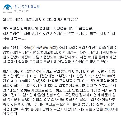청년공인회계사회가 외감법 개정안에 대해 강도높게 비판했다. (출처 : 청년공인회계사회 페이스북 캡처)