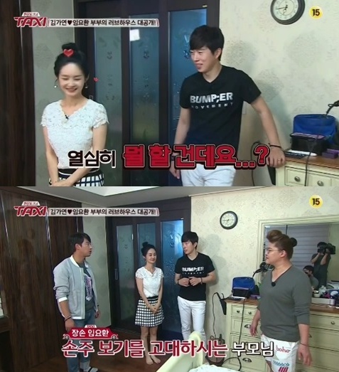 [아시아경제 온라인이슈팀] 임요환·김가연, 2세 계획 질문에 "열심히 하겠습니다"연상연하 커플 김가연 임요환 부부가 2세 계획을 밝혀 화제다.26일 방송된 케이블채널 tvN '현장토크쇼 택시'(이하 '택시')에는 임요환 김가연 부부가 출연해 입담을 과시했다.이날 방송에서 김가연은 부부의 침실을 공개했다. 그녀는 "우린 주로 게임방에 있고, 여기는 잘 안 쓰는 방이다. 창고나 마찬가지"라고 밝혀 주목을 받았다. 이에 MC들이 "임요환이 1남 3녀 중 장손인 것으로 알고 있는데, 대를 이어야 하지 않냐?"며 두 사람의 2세 계획에 관해 질문했다.2세 계획에 대해 김가연은 "열심히 하겠다"며 당찬 포부를 밝혔고, 임요환 역시 "부모님이 그 부분을 제일 중요하게 생각 하신다"며 솔직한 속내를 공개해 눈길을 끌었다.임요환 김가연 소식을 접한 네티즌은 "임요환 김가연, 2세 계획 있었구나" "임요환 김가연, 두 사람 닮은 아이 정말 예쁠 듯" "임요환 김가연, 침실이 창고가 되다니"등의 반응을 보였다.온라인이슈팀 issue@asiae.co.kr<ⓒ세계를 보는 창 경제를 보는 눈, 아시아경제(www.asiae.co.kr) 무단전재 배포금지>