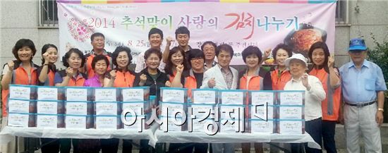 광주광역시 동구 계림1동 주민센터는 27일 추석맞이 사랑의 김치나누기 행사를 개최했다. 이 행사는 계림1동 자원봉사캠프와 한국마사회 광주지사, 대인치과 후원으로 김치를 담가 관내 소외계층 100세대에 전달했다.<br />