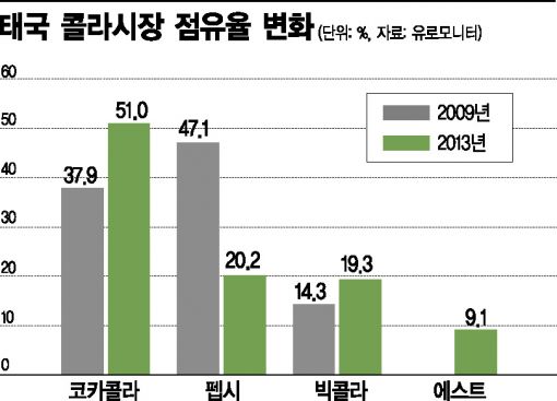 ◆토종 브랜드 에스트 돌풍= 에스트는 더 신생 브랜드다. 태국 업체 썸쑥이 2012년 말에 출시했다. 에스트는 사실상 시장 진출 첫해인 지난해 태국 콜라시장의 9.1%를 차지했다고 시장조사회사 유로모니터는 집계했다. 썸쑥은 태국에서 인기가 있는 잉글랜드 프리미어리그의 맨체스터 시티와 스폰서 계약을 체결하는 등 마케팅을 펴 브랜드 인지도를 단시간에 높였다. 썸쑥의 약진에는 이 회사가 이전 60년 동안 펩시의 파트너 역할을 하면서 음료 유통망을 갖춘 저력이 바탕이 됐다. 이 회사는 트럭 1200대와 냉장고 15만대를 갖추고 펩시콜라를 병입해 거래처 20만곳에 공급했다. 펩시는 2010년 썸쑥을 적대적으로 인수하려고 나섰지만 실패한다. 썸쑥은 백기사가 된 타이 베버리지를 대주주로 맞이하면서 독자적으로 콜라를 만들어 판다는 결단을 내린다. 썸쑥은 에스트 로고를 파랑·빨강·하양으로 칠했다. 태국 국기의 삼색이지만 펩시의 로고와 색이 같다. ◆펩시 점유율 반토막= 빅콜라와 에스트가 쑥쑥 성장하면서 펩시의 입지가 크게 위축됐다. 펩시는 2009년 태국 콜라시장의 47.1%를 점유했지만 지난해 시장점유율은 20.2%로 밀렸다. 펩시의 시장점유율 하락은 에스트가 뛰어든 지난해에 두드러졌다. 2009년 47.1%에서 2012년 36.6%로 3년 새 10.5%포인트 낮아진 데 비해 지난해에는 전년 대비 16.4%포인트 떨어졌다. 코카콜라가 반사이익을 얻어 시장점유율을 2009년 37.9%에서 지난해 51.0%로 높이며 1위 업체 자리에 올랐다. 코카콜라는 지난해 시장점유율에서 펩시를 추월했다고 닛케이는 전했다. 펩시와 코카콜라의 시장점유율 합계가 태국에서 70% 가까이로 떨어진 것이다. 일본과 중국을 비롯한 아시아 주요 시장에서는 브랜드 파워가 강력한 펩시와 코카콜라가 시장의 90% 이상을 장악한다. 수세에 몰린 펩시가 전열을 가다듬고 있다. 펩시는 2011년에 산미구엘의 태국 라용 음료공장을 인수한 뒤 80억바트(약 2500억원)를 들여 생산라인 8개를 가진 세계 최대 공장으로 확충했다. 펩시는 물류 기업 DHL 익스프레스와 손잡고 태국 내 유통망을 정비 중이다. 펩시코 타일랜드의 자그루트 코테차 음료부문 사장은 "우리의 브랜드 파워는 압도적"이라며 "선두 탈환은 시간문제에 불과하다"고 말했다. ◆내친 김에 해외로= 태국은 아시아 3위 콜라 소비국이다. 유로모니터에 따르면 지난해 태국 콜라시장 규모는 18억달러로 최근 5년간 25% 성장했다. 청량음료에서 콜라가 차지하는 비중이 30%에 달한다. 이는 10% 정도인 일본이나 중국을 크게 웃도는 수준이다. 닛케이는 태국의 매운 요리와 콜라가 음식궁합이 잘 맞는 듯하다고 풀이했다. 신흥 브랜드들은 태국 주변 시장도 넘보고 있다. 아헤는 베트남과 인도네시아, 인도에도 공장을 짓고 진출했다. 캄보디아와 미얀마에서도 판매에 나섰다. 썸쑥은 에스트를 글로벌 브랜드로 성장시킨다는 구상에 따라 동남아는 물론 유럽과 아프리카 진출도 검토 중이다. 백우진 기자 cobalt100@asiae.co.kr<ⓒ세계를 보는 창 경제를 보는 눈, 아시아경제(www.asiae.co.kr) 무단전재 배포금지>