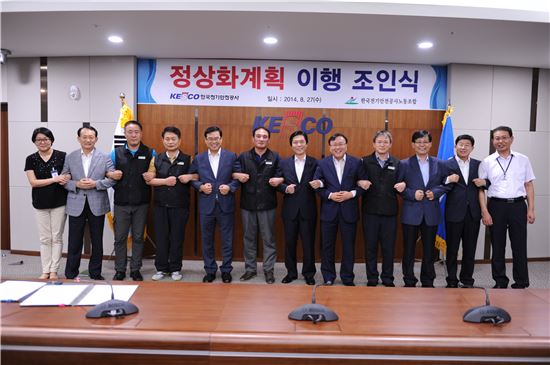 ▲이상권 한국전기안전공사 사장(오른쪽 여섯번째)과 김금구 노조 지부장(일곱번째)은 27일 전북 신사옥에서 방만경영 정상화 이행 조인식을 열고 합의서에 서명했다.