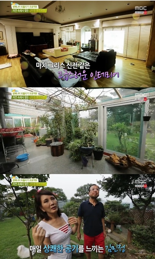 [아시아경제 온라인이슈팀] 김민정, 으리으리한 집 공개 "그리스 신전에 온 것 같아"탤런트 김민정의 화려한 집이 공개돼 화제다.김민정은 29일 오전 방송된 MBC '기분 좋은 날'에서 남편과 집에서 보내는 일상을 공개했다.경기도 용인시에 위치한 김민정의 집은 자연에 둘러싸인 전원주택이다. 그의 집에는 정원과 밭은 물론 온실까지 마련돼 있어 눈길을 끌었다. 특히 그녀의 집 중 높은 천장과 채광이 조화를 이룬 거실은 그리스 신전을 연상케 하는 고급스러운 인테리어로 감탄을 자아냈다. 김민정 집 소식을 접한 네티즌은 "김민정, 부럽다" "김민정, 진짜 힐링하우스네" "김민정, 저런 집 사려면 얼마?" 등의 반응을 보였다. 온라인이슈팀 issue@asiae.co.kr<ⓒ세계를 보는 창 경제를 보는 눈, 아시아경제(www.asiae.co.kr) 무단전재 배포금지>