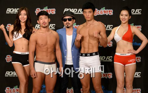 [아시아경제 김현민 기자] 국내 MMA 종합격투기 로드 FC 018을 하루 앞둔 29일 서울 홍은동 그랜드힐튼호텔에서 진행된 공개계체에서 라이트급 김창현(왼쪽)과 김석모가 가수 박상민, 로드걸과 포즈를 취하고 있다. 1차 계체에서 실패한 김창현은 1시간 뒤 2차 계체를 실시할 예정이다.김현민 기자 kimhyun81@asiae.co.kr<ⓒ세계를 보는 창 경제를 보는 눈, 아시아경제(www.asiae.co.kr) 무단전재 배포금지>