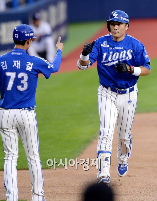 [아시아경제 김현민 기자] 프로야구 삼성 이승엽이 29일 서울 잠실구장에서 열린 프로야구 두산과의 경기, 2회초 1사에서 우월 솔로홈런을 치고 김재걸 코치와 하이파이브하고 있다. 김현민 기자 kimhyun81@asiae.co.kr<ⓒ세계를 보는 창 경제를 보는 눈, 아시아경제(www.asiae.co.kr) 무단전재 배포금지>