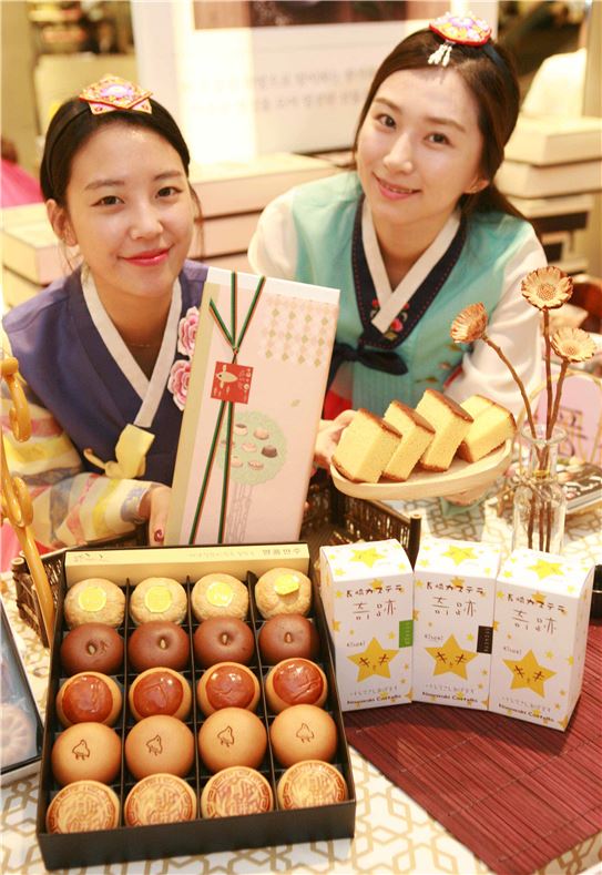 31일 AK플라자 분당점에서 사내모델들이 디저트류 추석선물세트를 선보이고 있다. 추석을 앞두고 다양한 선물세트가 등장한 가운데 AK플라자는 '장복용 과자공방 명품 만주', '키세키 나가사키 카스텔라' 등 유명 맛집 디저트를 선물세트로 선보였다.