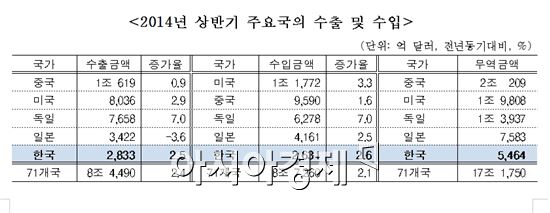 [아시아경제 김승미 기자]올해 상반기 세계 수입증가율은 소폭 회복에 그친 것으로 나타났다. 31일 한국무역협회 국제무역연구원이 발표한 ‘2014년 상반기, 세계 주요국의 무역동향’보고서에 따르면 세계 주요 71개국의 수입은 8조 7260억 달러로 전년동기 대비 2.1% 증가에 그쳤다. 이는 지난 해 상반기 수입증가율(-0.1%)에 비해서는 소폭 회복된 수치이지만, 글로벌 금융위기 이후 최근 5년간 2010년부터 올해까지 상반기 연평균증가율인 10.1%에 미치지 못했다.국가별로는 중국이 수출 1조 619억 달러, 수입 9590억 달러를 기록, 무역규모는 2조 209억 달러로 작년에 이어 세계 1위를 차지했다. 미국과 독일도 작년에 이어 각각 무역규모 2위와 3위를 유지했다. 우리나라는 수출 7위, 수입 9위, 무역 8위를 기록했다.수출의 경우 올해 상반기 독일, 이탈리아, 프랑스 등 유로존 국가와 일본은 금융위기 이전인 2008년 상반기 수준으로 회복되지 못한 것으로 나타났다. 일본은 2008년 상반기 대비 85% 수준, 프랑스와 이탈리아는 90% 수준에 머물렀다. 중국과 우리나라는 2008년에 비해 각각 59.2%, 32.4% 증가해 다른 국가들에 비해 빠른 회복세를 보였다.자료제공=무역협회