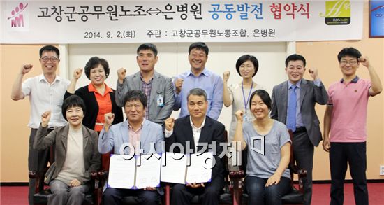 고창군공무원노동조합은 2일 광주 은병원과 상호 공동발전을 위한 업무협약을 체결하고 조합원의 건강검진 등 복지향상과 상호교류를 위해 협력을 다짐했다.<br /> <br /> 고창군청 2층 상황실에서 열린 공동발전 협약식에는 김용진 고창군노조위원장과 정정희 광주 은병원 경영원장을 비롯해 양 기관 임직원 16명이 참석해 협약을 체결하고 고창군공무원노조 조합원의 종합적인 건강검진 지원과 지역사회 발전을 위한 봉사활동 등 상호 공동발전을 위해 교류를 활성화하고 관심사에 대하여 지속적으로 협력키로 했다.<br /> <br /> 김용진 위원장은 “광주 은병원과 상호 신뢰를 바탕으로 공동발전을 위한 내실 있는 사업을 지속적으로 추진해 조합원들이 건강하고 활기찬 직장생활을 할 수 있도록 최선을 다하겠다”고 전했다.<br />