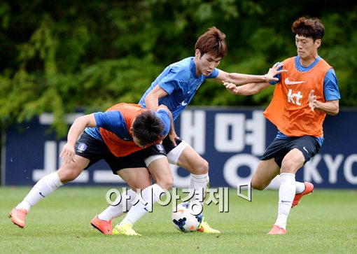 [파주=아시아경제 김현민 기자] 축구 국가대표팀 한국영(가운데)이 3일 경기도 파주 NFC에서 진행된 팀 훈련에서 김민우, 이청용과 볼을 다투고 있다. 김현민 기자 kimhyun81@asiae.co.kr<ⓒ세계를 보는 창 경제를 보는 눈, 아시아경제(www.asiae.co.kr) 무단전재 배포금지>