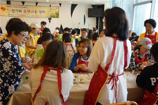 [아시아경제 박종일 기자] 대한적십자사 봉사회 마포지구협의회(회장 윤복재)는 3일 ‘다문화가족, 소외계층 어르신과 적십자 봉사원이 함께하는 한가위 나눔잔치’를 이룸웨딩컨벤션에서 개최했다. 마포구(구청장 박홍섭)와 한국중부발전(사장 최평락)이 후원한 이날 행사는 다문화가족 60세대와 지역 어르신 100여명을 초청, 적십자와 한국중부발전의 봉사원 60명이 송편을 함께 빚으며 한가위의 정을 나눈 시간이 됐다.박종일 기자 dream@asiae.co.kr<ⓒ세계를 보는 창 경제를 보는 눈, 아시아경제(www.asiae.co.kr) 무단전재 배포금지>