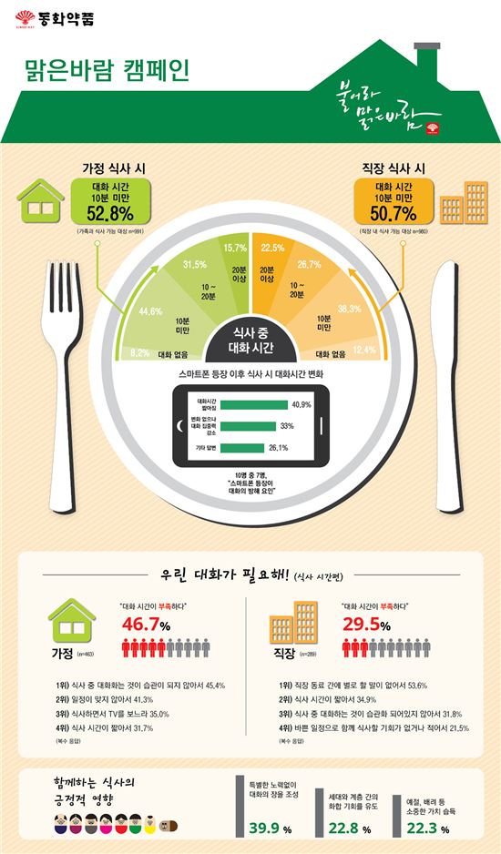 [아시아경제 이창환 기자] 대한민국 직장인 절반 이상은 가족이나 직장 동료와 식사하면서 대화를 나누는 시간이 10분도 채 되지 않는 것으로 조사됐다. 직장인들은 특히 스마트폰 등장 이후 식사 중 대화 시간이 줄고 대화에 집중하지 못하고 있다고 생각했다. 국내 최장수 제약기업 동화약품은 함께 소통하는 밥상의 중요성을 알리고자 펼치는 ‘맑은바람 캠페인’ 프로그램의 하나로 가족과 함께 거주하는 직장인 1000명을 대상으로 식사 시 소통 실태에 대해 조사한 결과는 4일 발표했다. 조사 결과 응답자의 절반 이상이 가정(52.8%, 523명)과 직장(50.7%, 497명)에서 식사 시 대화 시간이 10분에도 미치지 못한다고 답했다. 이 중 식사 중 대화를 전혀 나누지 않는다고 답한 응답자도 가정에서 8.2%(81명), 직장에서 12.4%(122명)나 차지하는 등 식사 중 소통이 부족한 것으로 나타났다. 스마트폰이 등장한 이후 가정과 직장 양쪽 모두 대화 시간이 짧아졌다고 답한 응답자가 40.9%(409명)에 달했으며 제대로 대화에 집중하지 못한다고 답한 응답자도 33%(330명)나 돼 스마트폰이 식사 중 대화의 큰 장애요인으로 지목됐다. 특히 중고교생 자녀를 둔 응답자의 50.6%(84명)가 스마트폰 등장 이후에 대화 시간이 짧아졌다고 답해 가장 높은 비율을 보였다.동화약품 맑은바람 캠페인 실천단의 서울대학교 생활과학연구소 이현아 교수는 ”우리나라는 장시간 근로문화로 인해 기본적인 식사 시간이 짧은데다 TV나 스마트폰이 등장하면서 밥상에서의 대화가 더 줄어들었다”며 “부모가 일방적으로 생각을 전달하기 보다 가족이 공통으로 관심을 보일만한 대화 주제를 만들고 이를 함께 나누려 노력해야 한다”고 말했다. 가족과의 식사와 직장 동료와의 식사 시 대화에 대해서는 온도차가 존재했다. 식사 중 평균 대화 시간은 가정에서 12분, 직장에서 13분으로 조사돼 서로 비슷한 양상을 보였다. 그러나 응답자의 절반(46.7%, 463명)가까이가 가정에서 식사 중 대화 시간이 짧은 편이라고 생각한 반면, 직장 동료와의 식사 중 대화가 부족하다고 답한 사람은 3명 중 1명(29.5%, 289명)에 불과했다. 대화 시간이 짧은 이유도 달랐다. 가족과의 식사 중 대화 시간이 짧다고 답한 사람 중에서는 ‘식사 중 대화하는 것이 습관이 되지 않아서’(45.4%, 210명)를 이유로 꼽은 사람이 가장 많았고, ‘바쁜 일정으로 함께 가족 간 식사할 기회 자체가 적어서’(41.3%, 191명)가 그 뒤를 이었다. 반면 직장에서는 ‘동료와 서로 할 말이 없어서’(53.6%, 155명)와 ‘식사 시간이 짧아서’(34.9%, 101명)를 대화 시간이 짧은 이유로 꼽았다. 가족과 함께하는 식사 시간이 불필요하거나 강제성이 없어야 한다고 답한 사람(42.9%, 429명) 중에서는 서로 일정을 맞추기 어려워(74.4%, 319명) 대화시간이 짧다고 대답한 사람이 가장 많았고, 직장에서의 식사 시간의 필요성을 크게 못 느끼는 사람(62.8%, 628명)들은 상하 관계가 식사 시간에도 이어진다는 것(28.2%, 177명)에 부담을 느끼는 것으로 드러났다. 대화가 활발한 식사 문화에 대해서는 긍정적으로 생각하는 비율이 높았다. 응답자들은 ‘특별한 노력 없이 대화의 장을 조성’(39.9%, 399명)가 할 수 있다는 점과 ‘세대와 계층 간의 화합 기회를 가질 수 있다’(22.8%, 228명)는 점을 함께하는 식사의 가장 큰 장점으로 꼽았다. 절반 정도 응답자(46.2%, 462명)는 개인의 노력 외에 가정과 직장 내 식사 시 활발한 소통을 위한 직장 등 조직의 지원이 필요하다고 답했다.맑은바람 캠페인 실천단인 생각과느낌 클리닉 정우열 원장(정신건강의학과 전문의)은 "식사 시간은 구성원이 특별한 노력 없이 만날 수 있는 기회인 만큼 자연스러운 대화 분위기가 중요하다"며 "특히 직장에서는 상하관계가 이어지지 않도록 상사가 더 노력해야 한다”며, “밥상에서 나누는 이야기를 통해 가정뿐 아니라 조직과 세대 간의 활발한 소통 역시 가능해질 것"이라고 강조했다.우리나라에서도 밥상에서의 교육과 소통에 관한 관심이 높아지며, 실천 의지 고취와 중요성을 전하기 위해 다양한 기관들이 노력 중이다. 동화약품 역시 밥상머리 교육의 중요성을 알리는 ‘맑은바람 캠페인’(소개 별첨)을 전개하며 동참하고 있다. 이번 조사 결과에서 동화약품이 지속적인 캠페인 진행에 대한 결실을 엿볼 수 있다. 밥상머리 교육에 대한 인지도가 90%를 넘어섰으며, 동화약품의 맑은 바람 캠페인을 알고 있다고 답한 사람도 10명 중 4명이나 됐다. 하지만 인지가 행동 변화로 이어지는 경우는 낮아 구체적 실천법에 대한 전달이 필요한 것으로 나타났다. 동화약품은 이에 올해에는 해당 분야 전문가를 ‘맑은바람 캠페인’의 자문위원으로 참여할 수 있도록 해 실천 방안 등을 구체적으로 제시할 예정이다. 이번 설문조사는 동화약품이 한국 갤럽에 의뢰해 지난 6월부터 7월까지 가족과 함께 거주하는 20대~50대 직장인 1000명을 대상으로 온라인 설문방식으로 진행됐다.이창환 기자 goldfish@asiae.co.kr<ⓒ세계를 보는 창 경제를 보는 눈, 아시아경제(www.asiae.co.kr) 무단전재 배포금지>