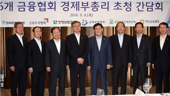 ▲최경환 부총리 겸 기획재정부 장관이 4일 서울 프레스센터에서 열린 '6개 금융협회단체장 경제부총리 초청간담회'에 참석해 기념 사진을 찍고 있다.