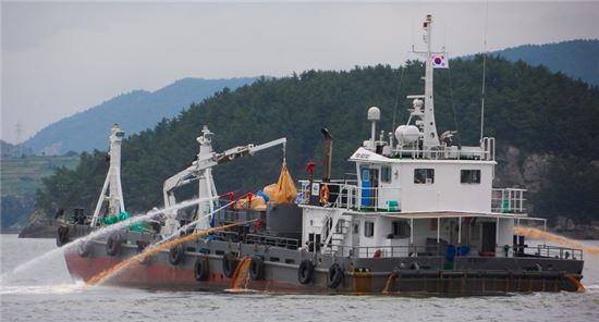 [여수 인근 해역 등에 적조경보가 발령됨에 따라 여수시와 수산당국이 방제선을 동원해 황토를 살포하고 있다.]