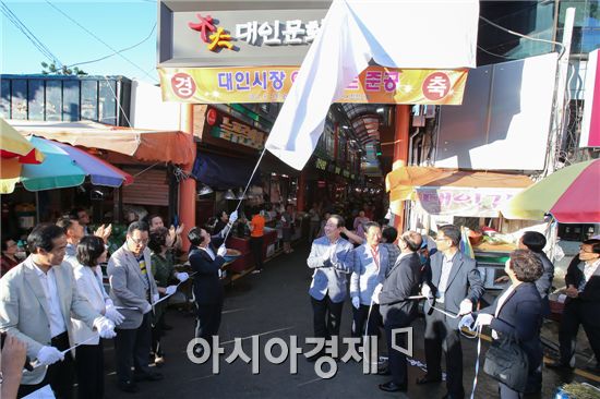 광주광역시 동구는 4일 노희용 동구청장, 동구의회 의원, 대인시장 상인회장, 상인 등이 참석한 가운데 대인시장 아케이드 현판식을 가졌다. 사진제공=광주시 동구<br />
