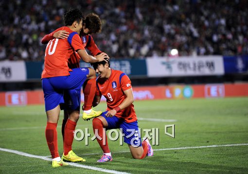 [부천=아시아경제 김현민 기자] 5일 경기도 부천종합운동장에서 열린 축구 국가대표팀과 베네수엘라의 평가전에서 이동국이 역전골을 넣고 손흥민과 세레모니를 하고 있다. 김현민 기자 kimhyun81@asiae.co.kr<ⓒ세계를 보는 창 경제를 보는 눈, 아시아경제(www.asiae.co.kr) 무단전재 배포금지>