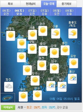 [아시아경제 김보경 기자] 추석 연휴 첫날인 6일 전국이 대체로 맑겠으나 제주도와 남해안 일부 지역에는 비가 올 전망이다. 기상청에 따르면 이날 서해상에 위치한 고기압의 영향을 받아 전국이 구름 많다가 아침부터 점차 맑아지겠다. 제주도와 남해안은 기압골의 영향으로 대체로 흐리고 가끔 비(강수확률 60%)가 오다가 오후에 갤 것으로 보인다. 예상 강수량은 제주도가 5~40㎜, 전남남해안과 경남해안은 5~10㎜다. 기상청 관계자는 "오늘과 내일(7일) 아침 서해안과 일부 내륙에서 안개가 짙게 끼는 곳이 많겠으니, 교통안전에 주의하기 바란다"고 밝혔다. 낮 최고기온은 26~31℃로 어제와 비슷하거나 조금 높겠으나, 동해안은 어제보다 낮겠다. 당분간 일교차가 10도 내외로 커 건강관리에 유의해야겠다. 바다의 물결은 전해상에서 0.5~2.0m로 일겠다. 전해상에는 안개가 끼는 곳이 있고, 남해상에서는 돌풍과 함께 천둥·번개가 치는 곳이 있겠다. 한편 이날 미세먼지(PM10) 수준은 제주권은 '좋음(일평균 0~30㎍/㎥)', 그 밖의 권역은 '보통(일평균 31~80㎍/㎥)'으로 예보됐다. 김보경 기자 bkly477@asiae.co.kr<ⓒ세계를 보는 창 경제를 보는 눈, 아시아경제(www.asiae.co.kr) 무단전재 배포금지>