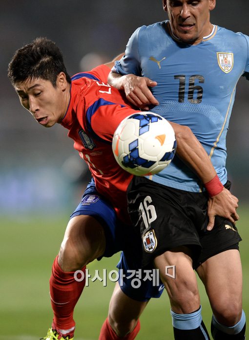 [고양=아시아경제 김현민 기자] 축구 국가대표팀 이근호가 8일 경기도 고양종합운동장에서 열린 우루과이와의 평가전에서 상대와 볼을 다투고 있다. 김현민 기자 kimhyun81@asiae.co.kr<ⓒ세계를 보는 창 경제를 보는 눈, 아시아경제(www.asiae.co.kr) 무단전재 배포금지>