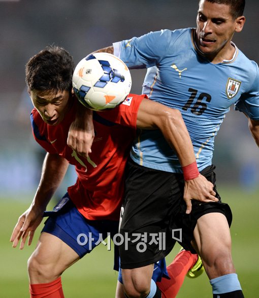 [고양=아시아경제 김현민 기자] 축구 국가대표팀 이근호가 8일 경기도 고양종합운동장에서 열린 우루과이와의 평가전에서 상대와 볼을 다투고 있다. 김현민 기자 kimhyun81@asiae.co.kr<ⓒ세계를 보는 창 경제를 보는 눈, 아시아경제(www.asiae.co.kr) 무단전재 배포금지>