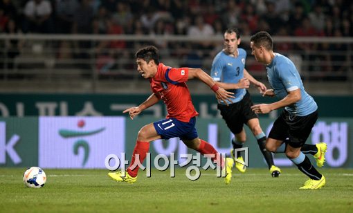 [고양=아시아경제 김현민 기자] 축구 국가대표팀 이근호가 8일 경기도 고양종합운동장에서 열린 우루과이와의 평가전에서 상대 수비를 뚫고 공격하고 있다. 김현민 기자 kimhyun81@asiae.co.kr<ⓒ세계를 보는 창 경제를 보는 눈, 아시아경제(www.asiae.co.kr) 무단전재 배포금지>