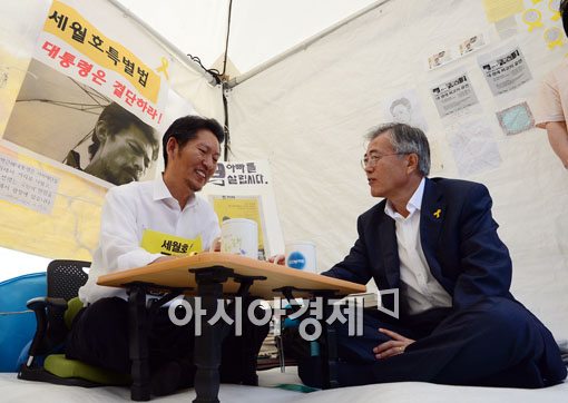 [아시아경제 백소아 기자] 9일 서울 광화문광장 세월호 단식농성장에서 문재인 새정치민주연합 의원(오른쪽)이 19일째 단식 농성 중인 정청래 의원(왼쪽)을 만나 이야기를 나누고 있다.백소아 기자 sharp2046@asiae.co.kr<ⓒ세계를 보는 창 경제를 보는 눈, 아시아경제(www.asiae.co.kr) 무단전재 배포금지>