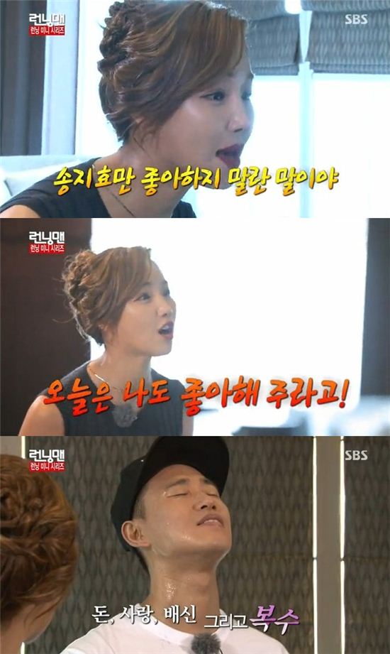 [아시아경제 온라인이슈팀] "송지효만 좋아하지마!" 연민정 빙의한 이유리에 송지효 반응이…배우 이유리가 '런닝맨'에 깜짝 출연해 악녀 연기를 선보였다. 지난 7일 오후 방송된 SBS '일요일이 좋다-런닝맨'에서는 희대의 악녀 6인방 이유리, 최여진, 서우, 유인영, 김민서, 송지효가 나란히 등장했다.이날 MBC 주말드라마 '왔다! 장보리'에서 악녀 연민정 역으로 인기를 끌고 있는 이유리는 극 중 역할에 빙의해 개리에게 "지금 여기서 뭐 하는 거야. 그저 밥 밥 밥! 사람이 밥만 먹고 살아? 당신이 소·돼지야? 당신이 식충이와 다른 게 뭐가 있냐"면서 연기했다. 이어 이유리는 개리에게 "네가 내 인생에 끼어들면서 내 인생에 구정물이 튄 거라고"라면서 물이 든 컵을 들기 시작했다. 당황한 개리는 "설마"라고 외치며 이유리를 말렸다. 하지만 이유리는 "너가 기다리던 게 이거야?"라고 말했다.이에 개리는 "내가 도대체 잘못한 게 뭐냐"고 억울해 했고, 이유리는 "너는 날 탓할 게 아니라 너가 그렇게 매력 터지는 네 인생을 탓하라고! 송지효만 좋아하지 말란 말이야. 오늘은 나도 좋아해주라고!"라고 말해 폭소를 터뜨렸다. 소식을 접한 누리꾼들은 “런닝맨 송지효 이유리 재밌었어” “송지효 악녀연기 잘하네” “송지효 이유리 장난 아니네” 등의 반응을 보였다. 온라인이슈팀 issue@asiae.co.kr<ⓒ세계를 보는 창 경제를 보는 눈, 아시아경제(www.asiae.co.kr) 무단전재 배포금지>
