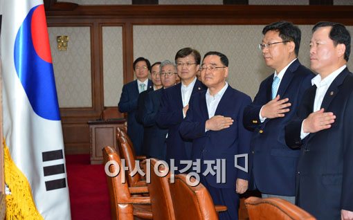 [아시아경제 백소아 기자] 11일 서울 세종로 정부서울청사에서 열린 국무회의에서 정홍원 국무총리(오른쪽부터 세번째)를 비롯한 국무위원들이 국기에 대한 경례를 하고 있다. (오른쪽부터)박경국 안전행정부 차관, 주재환 기획재정부 차관, 정 총리, 최양희 미래창조과학부 장관, 김종덕 문화체육관광부 장관, 윤성규 환경부 장관백소아 기자 sharp2046@asiae.co.kr<ⓒ세계를 보는 창 경제를 보는 눈, 아시아경제(www.asiae.co.kr) 무단전재 배포금지>
