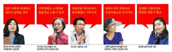 지역단체들간 얼굴 보기도 힘든 열악한 상황 서로간의 효율적인 소통과 협업 시스템 필요 [아시아경제 김동선 기자, 김보경 기자, 김민영 기자, 주상돈 기자] 추석 연휴인 지난 10일 서울 종로 주한일본대사관 앞에는 어김없이 수요집회가 열렸다. 1992년 1월 처음 개최된 이래 1143번째다. 세계에서 가장 장기간 지속된 시위로 기네스북에 오른 수요집회. 일본군 위안부 문제가 오랫동안 미결된 채 남아있다는 반증이기도 하다. 이날 집회에는 항상 자리를 지켰던 길원옥 할머니가 건강문제로 참석하지 못했다. 새벽에 중환자실에 입원할 정도로 위급한 상황이었다. 윤미향 한국정신대문제협의회(이하 정대협) 상임대표는 "할머니들에게 시간이 절박한 게 사실"이라며 "한국 정부와 사회가 할머니들에게 어떤 존재인지, 또 무엇을 해야 하는지 심각하게 고민해야 할 때"라고 말했다. 위안부 문제 해결을 위해 우리 사회에 남겨진 과제는 무엇이고, 관련 시민단체의 운동과 피해자 할머니를 위한 지원은 어떤 방향으로 가야할까. '위안부 보고서 55' 시리즈를 마무리하며 윤미향 정대협 대표, 안신권 나눔의집 소장, 이경희 일본군위안부할머니와함께하는 마창진시민모임 대표, 안이정선 정신대할머니와함께하는 시민모임 대표, 김정화 남해여성회 대표 등 시민단체 대표들의 목소리를 들어봤다.-시민단체의 '위안부 운동'은 어떤 방향으로 나가야 하나.▲안신권 소장(이하 안)= 민간단체는 아시아 각국의 피해자, 관련단체들과 연대해 일본 전범기업을 상대로 미국법정에서 소송을 제기하고, 해외 기림비와 평화의 소녀상 건립을 통해 다각적으로 일본 정부를 압박해야 한다. 특히 국제 연대와 공조를 통해 세계가 하나의 공감대를 형성할 필요가 있다. 이런 식으로 일본 정부의 전향적인 자세를 촉구하는 국제적 압력을 행사해야 한다.▲윤미향 대표(이하 윤)= 지금까지 국제적인 압박을 활용한 위안부 운동을 했다면, 앞으로는 변화를 향한 일본 국민들의 열망을 이용해야 한다는 생각이다. 즉, 일본 국민이 주축이 돼서 일어나게 하는 것이다. 최근 우익화로 치닫는 일본 정부에 맞서 대항하는 시민단체들이 늘고 있다. 이 운동을 지원하면서 내적인 압력을 만들어가야 한다. 일본 사회 내에서 위안부 문제에 대한 제대로 된 의식을 공유, 계승시켜 나가야 할 것이다. 실제로 우리와 공조하는 일본의 여성단체는 위안부 문제에 대한 인식 변화를 위해 교육 운동을 펼칠 준비를 하고 있다.▲이경희 대표(이하 이)= 지금까지 국내 위안부 운동은 정대협이 선도적으로 열심히 해왔다. 앞으론 지역 단체들과 온 국민이 함께 관심을 갖고 운동을 확장시켜 나가는 게 숙제다. 그러려면 먼저 위안부 문제에 대한 시민단체와 대중들의 인식 차이를 줄여야 한다. 여전히 많은 사람들이 위안부 문제를 민족주의적 관점으로 보고 있는 게 사실이다. 하지만 당시 위안부 제도의 뿌리는 전시에 여성의 몸을 도구화한 관습과 가부장적 문화였다. 우리는 '인권단체'고, 위안부 문제도 명백한 인권문제, 그 중에서도 여성인권의 문제다.-정부부처ㆍ전문가 집단과의 협력도 필요할 것 같다.▲안이정선 대표(이하 안이)= 현재 지역의 시민단체들은 여러모로 소외당하는 아쉬움과 어려움이 있다. 일본 정부에 대응하려면 먼저 국내 관련 단체들의 횡적 연대가 이뤄져야 할 것이다. 무엇보다 외교부와 여성가족부, 시민단체 활동가들과 연구자들의 효율적인 소통과 협업 시스템이 절실하다.▲김정화 대표(이하 김)= 지역 시민단체들은 서로 얼굴 보고 만나는 것조차 힘들 정도로 상황이 열악하다. 단체별로 사업을 추진할 때 통일적인 전문가 집단과 함께 '민관 협의체'를 구성한다면 위안부 문제 해결에 대한 비약적인 성숙도 기대해 볼 만하다.▲윤= 민관 협력체 구성에는 반대한다. 민간단체와 정부가 해야 할 일은 다르다. 단체들이 각자 세운 목적대로 그 영역 속에서 활동을 열심히 하고, 큰 사업이 있거나 이슈가 발생해 연대해야 할 때 태스크포스(TF)팀을 만들어서 임시로 모여 논의할 수는 있을 것이다. 하지만 정부를 비판하고 견제해야 하는 조직이 비정부기구(NGO)다. NGO가 철저하게 독립성을 보장받고, 공정성 있는 활동을 해야만 대통령이나 외교부 장관을 향해서도 비판의 목소리를 낼 수 있다고 본다.▲안= 일반 대중의 역할도 무시할 수 없다. 최근 미국 캘리포니아 플러턴 시의회에서 소녀비 건립을 위한 투표를 진행했는데 3대 2로 아슬아슬하게 통과됐다. 당초 압도적인 득표수로 통과될 거라고 예상했으나, 일본계 미국인들이 각종 소셜네트워크서비스(SNS)를 통해 이에 항의하는 여론을 형성한 결과다. 우리 국민들도 이런 사안이 터졌을 때 소녀상 설립을 반대하는 반역사적ㆍ반인권적 주장에 맞서 설립 정당성에 대한 어필과 지지, 응원 등을 해야 한다.