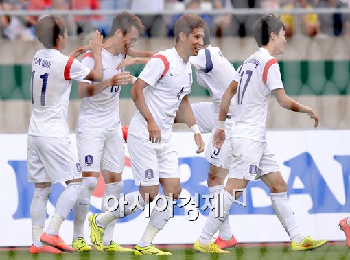 [아시아경제 김현민 기자] 14일 인천 문학경기장에서 열린 제17회 인천아시아경기대회 남자 축구 조별예선 대한민국과 말레이시아의 경기에서 임창우가 선제골을 넣고 동료들과 기쁨을 나누고 있다. 김현민 기자 kimhyun81@asiae.co.kr<ⓒ세계를 보는 창 경제를 보는 눈, 아시아경제(www.asiae.co.kr) 무단전재 배포금지>