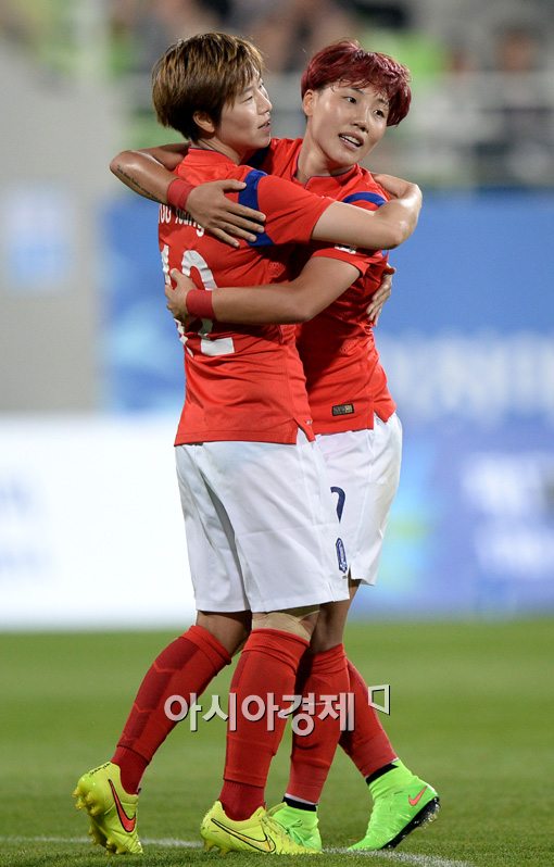[인천=아시아경제 김현민 기자] 14일 인천 남동아시아드럭비경기장에서 열린 제17회 인천아시아경기대회 여자 축구 조별예선 대한민국과 태국의 경기에서 유영아가 쐐기골을 성공시키고 정설빈과 기뻐하고 있다. 김현민 기자 kimhyun81@asiae.co.kr<ⓒ세계를 보는 창 경제를 보는 눈, 아시아경제(www.asiae.co.kr) 무단전재 배포금지>
