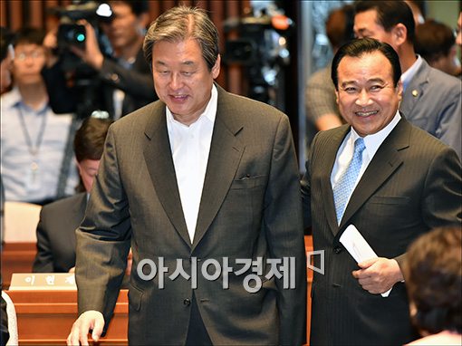 [아시아경제 윤동주 기자] 김무성 새누리당 대표(왼쪽)와 이완구 원내대표가 15일 서울 여의도 국회에서 열린 의원총회에 참석 하고 있다.윤동주 기자 doso7@asiae.co.kr<ⓒ세계를 보는 창 경제를 보는 눈, 아시아경제(www.asiae.co.kr) 무단전재 배포금지>