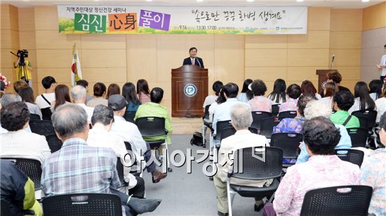광주 남구(구청장 최영호)는 16일 오후 구청 대회의실에서 지역주민 300여 명을 대상으로 우울 및 스트레스 예방을 위한 ‘심신풀이(心身free) 정신건강 세미나’를 개최했다. 사진제공=광주시 남구