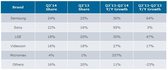 [아시아경제 권해영 기자] 급성장하는 인도 TV 시장에서 일본 소니와 인도 현지 제조사가 한국 추격을 가속화하고 있다. 인도는 12억 인구를 확보해 향후 북미, 유럽, 중국을 잇는 거대 시장으로 성장할 전망이라 이 지역을 둘러싼 글로벌 업체간 경쟁이 더욱 가열될 전망이다.18일 시장조사업체 디스플레이서치가 발표한 '인도 분기별 TV 출하량 및 예상 보고서'에 따르면 올해 2분기 인도 내 전체 LCD TV 출하량은 총 220만대로 전년 동기 대비 42% 증가했다. 이는 최근 여섯 분기만에 가장 큰 폭의 증가율로 새로운 TV 제품 출시, 가격 인하 등으로 빠르게 성장중인 인도 TV 시장의 추세를 반영했다.주목되는 점은 일본 소니와 현지 스마트폰 업체인 마이크로맥스의 급성장이다.삼성전자와 LG전자의 2분기 평판 TV 시장 점유율이 전년 동기 대비 각각 1%포인트, 2%포인트 감소한 반면 소니는 점유율을 6%포인트나 끌어올리며 LG전자를 제치고 2위 자리를 꿰찼다. 삼성전자는 소니를 2%포인트 차로 앞지르며 가까스로 1위를 유지했다.같은 기간 '인도판 샤오미'로 유명한 현지 스마트폰 업체 마이크로맥스는 점유율을 1%에서 4%로 확대하며 지난해 TV 사업을 시작한 이후 1년여만에 단숨에 5위권 내로 진입했다. 마이크로맥스는 인도 스마트폰 시장에서도 삼성전자와 1위 자리를 놓고 다투는 등 급성장하는 업체다.인도 평판 TV 시장 상위 5위 업체들의 연간 성장률은 마이크로맥스가 337%로 가장 높았고 뒤를 이어 소니(95%), 삼성전자(36%), LG전자(30%), 비디오콘(27%) 순이었다.업계에서는 12억 인구를 확보한 인도가 미국, 유럽, 중국을 잇는 주요 시장으로 급부상하고 있는 만큼 현지에서 해외 업체의 추격에 촉각을 곤두세우는 모습이다.소니는 실적 악화로 연초 TV 사업을 분사했지만 여전히 기술 리더십을 확보하고 있고 점유율 확대에도 힘을 쏟고 있다. 특히 이달초 독일 베를린에서 열린 'IFA 2014'에서는 기존 프리미엄 제품 위주에서 벗어나 다양한 기능, 가격대의 제품을 선보이며 소비자층을 확대하는 움직임이 두드러졌다는 게 업계 안팎의 분석이다.스마트폰에 이어 TV까지 출시해 종합 전자업체로 도약을 노리는 마이크로맥스 또한 향후 제품간 시너지를 확대하고 스마트폰 브랜드 파워를 기반으로 TV 시장 영향력을 확대해 나갈 가능성이 예상된다.국내 TV 업계 관계자는 "소니가 기존에는 프리미엄 TV에 집중했다면 최근에는 기술 리더십을 선보이는 것 못지 않게 가격대를 낮춘 다양한 제품을 선보여 실질적인 시장 점유율 확대에 나서는 양상"이라며 "인도 시장에서 국내 업체의 점유율이 소폭 하락한 것은 일시적인 현상인 것으로 보이지만 소니와 현지 업체의 부상을 예의주시하고 있다"고 말했다.권해영 기자 roguehy@asiae.co.kr<ⓒ세계를 보는 창 경제를 보는 눈, 아시아경제(www.asiae.co.kr) 무단전재 배포금지>
