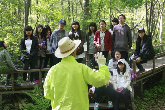 숲체원·산림치유 프로그램에 참가한 청소년들이 숲속 나무에 대해 설명을 듣고 있다.