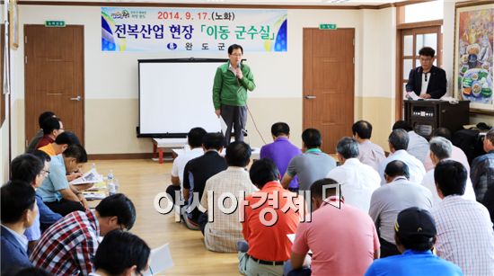신우철 완도군수가 대표 주력산업인 전복산업의 지속성장을 위한 백년대계를 위해 어업인과 머리를 맞대고 대책마련을 위해 노화 북고리에서 이동군수실을 운영하고 있다<br />