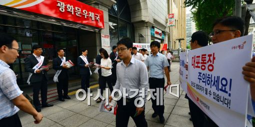 [아시아경제 최우창 기자] 18일 서울 광화문우체국 앞에서 집배원, 우체국 창구 직원 등이 대포통장 근절 캠페인을 하고 있다.우정사업본부에 따르면 지난해 대포통장 피해 건수는 2만여 건, 피해액은 1천400억 원에 달한 것으로 나타났다.최우창 기자 smicer@asiae.co.kr<ⓒ세계를 보는 창 경제를 보는 눈, 아시아경제(www.asiae.co.kr) 무단전재 배포금지>