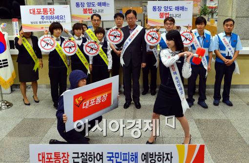 [아시아경제 최우창 기자] 18일 서울 광화문우체국에서 열린 '대포통장과의 전쟁 선포식에서 집배원, 우체국 창구 직원 등이 대포통장을 근절하자는 의미로 '불법 대포통장'이라고 적힌 팻말을 부수는 퍼포먼스를 선보이고 있다.우정사업본부에 따르면 지난해 대포통장 피해 건수는 2만여 건, 피해액은 1천400억 원에 달한 것으로 나타났다.최우창 기자 smicer@asiae.co.kr<ⓒ세계를 보는 창 경제를 보는 눈, 아시아경제(www.asiae.co.kr) 무단전재 배포금지>