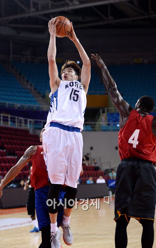 [인천=아시아경제 김현민 기자] 아시안게임 농구 국가대표팀 김종규가 18일 인천 삼산월드체육관에서 열린 외국인선수연합팀과의 연습경기에서 레이업슛을 하고 있다.김현민 기자 kimhyun81@asiae.co.kr<ⓒ세계를 보는 창 경제를 보는 눈, 아시아경제(www.asiae.co.kr) 무단전재 배포금지>