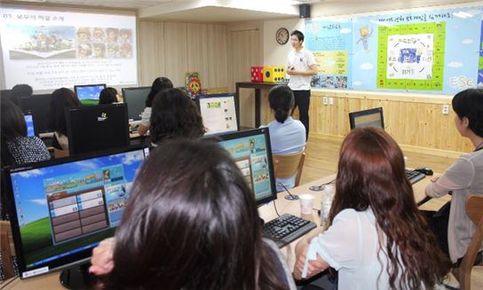 '학부모 게임문화교실'에서 자녀들이 좋아하는 게임을 체험해보는 학부모들(넷마블 제공)