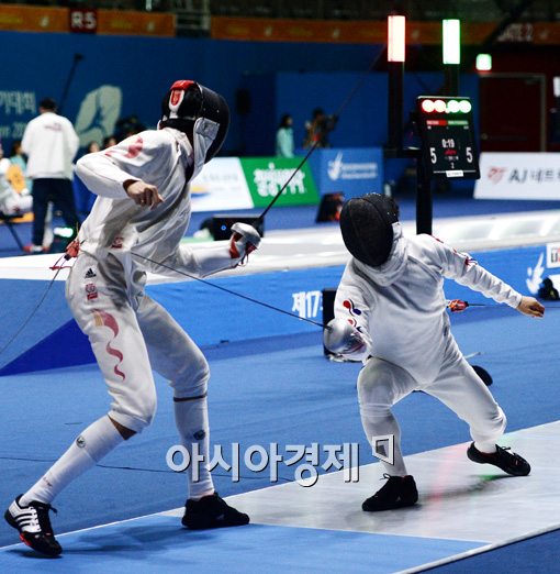 [고양=아시아경제 김현민 기자] 남자 펜싱 박경두가 20일 경기도 고양실내체육관에서 열린 제17회 인천아시안게임 펜싱 에뻬 16강전, 중국의 동 샤오와 대결을 펼치고 있다. 김현민 기자 kimhyun81@asiae.co.kr<ⓒ세계를 보는 창 경제를 보는 눈, 아시아경제(www.asiae.co.kr) 무단전재 배포금지>