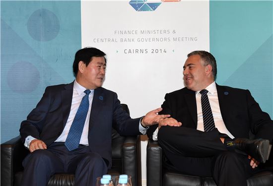 최 부총리와 호키 장관은 한·호주 FTA가 양국 경제협력 강화를 위해 "빠른 시일내에 발효되기를 기대한다"고 뜻을 모았다. 정부는 지난해 12월 타결된 한·호주 FTA 비준 동의안을 최근 국회에 제출했고, 호주는 지난 5월 한·호주 FTA의 의회 심의를 개시해 9~10월 중 발효를 위한 국내절차가 완료되는 것으로 알려졌다.한·호주 FTA는 양국이 국내 절차를 완료했음을 서면으로 서로 통보하는 날부터 30일 후 또는 양국이 합의하는 날에 발효된다.호키 장관은 "한·호주 FTA가 아직 비준되지는 않았지만 협상 타결 이후에 이미 호주 기업과 한국 기업들의 상호 교류가 증가하고 있는 것으로 안다"고 말했다.또 최 부총리는 "올해 G20의 논의가 세계경제의 성장 강화를 위해 매우 적절한 주제로 구성돼 있다"면서 "G20에서 중점적으로 논의하고 있는 '인프라 투자 확대'는 한국 뿐 아니라 모든 국가에게 있어서 성장 강화를 위해 매우 중요한 과제"라고 전했다. 호키 호주 재무장관은 "'인프라 투자 확대'를 위한 한국의 정책 노력과 G20에서의 기여를 높이 평가한다"면서 "11월 호주 브리즈번에서 열리는 G20 정상회의까지 가시적인 성과 도출을 위해 노력할 것"이라고 말했다.두 장관은 또 아시아 펀드 패스포트(Asia Regional Fund Passport) 등 아시아태평양경제협력체(APEC) 역내에서의 금융협력 논의도 지속하기로 약속했다. 아시아 펀드·패스포트는 회원국간 펀드 상호교차 판매를 허용하는 제도로 2013년부터 아시아태평양경제협력체(APEC)에서 논의되고 있다.두 장관은 G20과 APEC 등 다자협의체와 국제기구에서 양국의 긴밀한 협력관계를 지속 유지하고, 양자간 경제·금융 협력도 강화해 나가기로 했다.케언즈(호주)=이윤재 기자 gal-run@asiae.co.kr<ⓒ세계를 보는 창 경제를 보는 눈, 아시아경제(www.asiae.co.kr) 무단전재 배포금지>