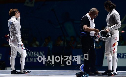 [고양=아시아경제 김현민 기자] 여자 펜싱 이라진(왼쪽)이 20일 경기도 고양실내체육관에서 열린 제17회 인천아시안게임 펜싱 사브르 준결승전에서 상대 중국 리 페이의 장비 점검을 바라보고 있다. 김현민 기자 kimhyun81@asiae.co.kr<ⓒ세계를 보는 창 경제를 보는 눈, 아시아경제(www.asiae.co.kr) 무단전재 배포금지>