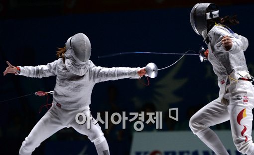 [고양=아시아경제 김현민 기자] 여자 펜싱 김지연(왼쪽)이 20일 경기도 고양실내체육관에서 열린 제17회 인천아시안게임 펜싱 사브르 준결승전에서 중국의 센첸과 대결하고 있다. 김현민 기자 kimhyun81@asiae.co.kr<ⓒ세계를 보는 창 경제를 보는 눈, 아시아경제(www.asiae.co.kr) 무단전재 배포금지>