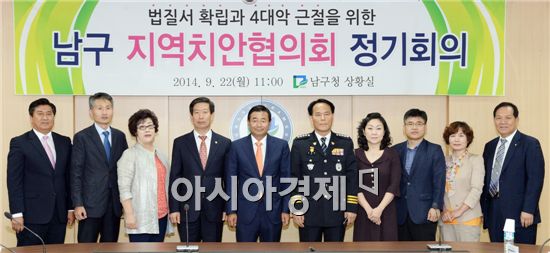 광주 남구는 22일 오전 구청 상황실에서 최영호 구청장을 비롯한 광주남부경찰서 김성열 서장 등 지역치안협의회 위원 13명이 참석한 가운데 법질서 확립과 4대악 근절을 위한 ‘남구 지역치안협의회 정기회의’를 개최했다. 사진제공=광주시 남구<br />
