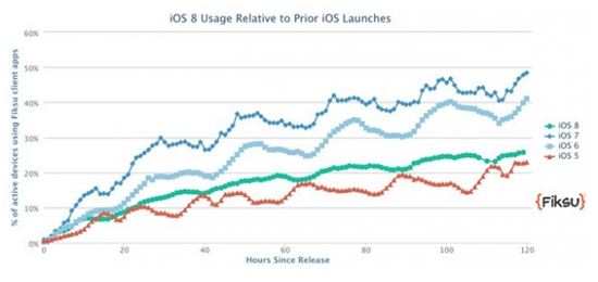 iOS 8 채용률, 아이폰6와 아이폰6 플러스 출시에 힘입어 30% 육박iOS 7의 배포 후 같은 기간 동안 채용률 50%보다 크게 낮은 수치[아시아경제 이초희 기자] iOS 8 채용률이 아이폰6와 아이폰6 플러스 출시로 30%에 육박한 것으로 알려졌다.22일(현지시간) 해외 정보기술(IT) 전문매체 아이라운지(iLounge)는 애플리케이션 마케팅 기업 픽수(Fiksu)의 데이터를 인용해 iOS8의 채용률이 지난 주말 아이폰6와 아이폰6 플러스의 출시에 힘입어 30%에 육박했다고 전했다.이 수치는 지난주 발표된 초기 iOS8 채용률 15%에 비해 거의 배가 상승한 것이다. 하지만 작년 iOS7의 배포 후 같은 기간 동안의 채용률 50%보다는 크게 낮은 것이다. 애플은 아직 iOS8 채용률을 공식적으로 발표하지 않았다.이 같은 채용률 전망은 앞서 여러 외신들을 통해 알려졌다. 지난 18일 IT 전문매체 마셔블(Mashable)도 미국의 모바일 광고플랫폼업체 탭조이(Tapjoy)의 데이터를 인용해 iOS8의 채용률이 iOS7과 iOS6보다 뒤지고 있다고 보도했다. 이 데이터에 따르면 18시간 동안 iOS8의 채용률은 6%에 불과해 iOS6의 8%와 iOS7의 15%에 비해 크게 뒤지는 것으로 나타났다. 또 미국의 애플 전문 매체 나인투파이브맥(9to5mac)도 픽수의 데이터를 인용해 iOS8의 채용률은 첫 18시간 동안 7.92%로 나타났고, iOS7은 17%였다고 전했다. 한편 애플은 지난 17일 스마트홈 기능을 탑재한 최신 모바일 플랫폼인 iOS8 업데이트를 시작했다. iOS8은 신제품 아이폰6와 아이폰6플러스에는 미리 탑재돼 출시되며 아이폰4S 이후 모델, 아이패드2 이후 모델, 아이팟 터치 5세대에서 사용 가능하다.이초희 기자 cho77love@asiae.co.kr<ⓒ세계를 보는 창 경제를 보는 눈, 아시아경제(www.asiae.co.kr) 무단전재 배포금지>