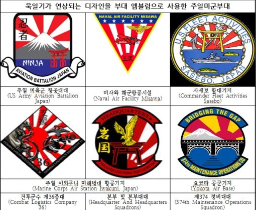 일본 제국주의 침탈의 상징 욱일기 연상시키는 디자인을 사용한 주일 미군부대 엠블럼(사진제공=최재천의원실)